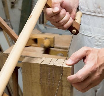 Börja på laxstjärtsfogen. Stryk färg på tapparna på den gamla tröskeln och överför dem till den nya. Såga ut tapparna med fintandad såg. Såga på utsidan av strecken så att tapparna blir lite för stora. De justeras sedan med stämjärn.