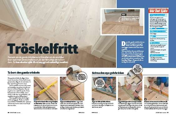 Den gamla tröskeln ska sågas i bitar innan den tas bort. Detta skulle kunna göras med en såg och ett snett snitt. Se bara upp så att golven inte repas.