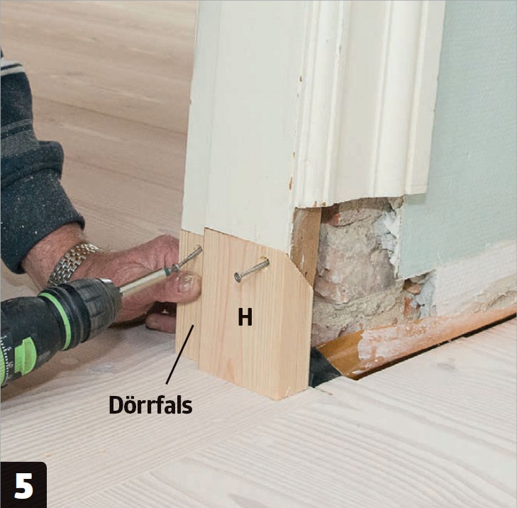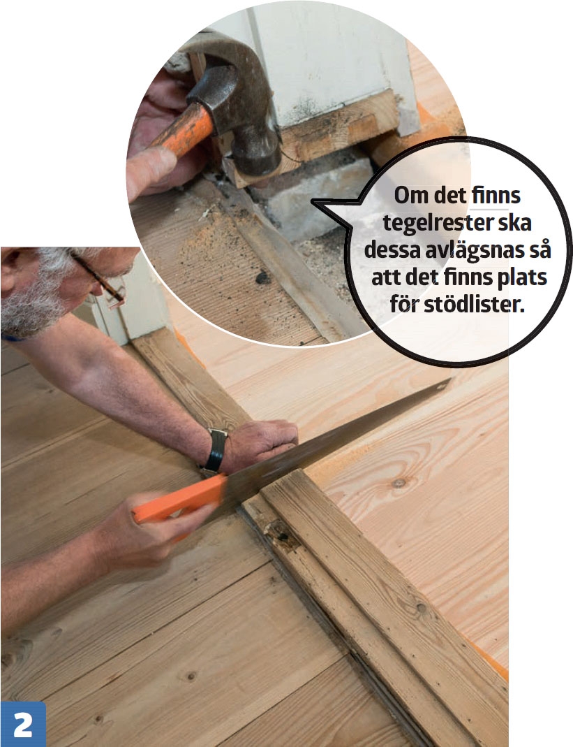Den nya golvbrädan ska ha något stabilt att ligga på. Vi skruvar därför fast stödlister. Nivåskillnaden utjämnar vi dessutom med en extra tunn list på den ena sidan.