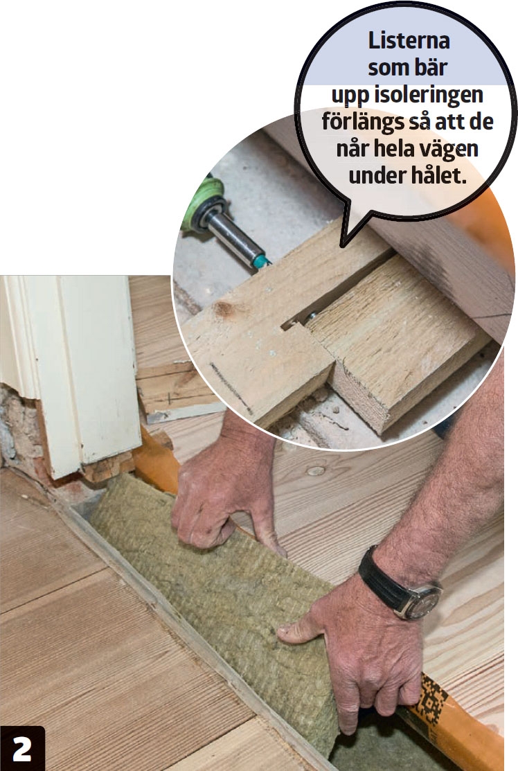 Lägg isoleringen under den nya tröskeln. Här ska två lager läggas. Först en hård isoleringsskiva som tål drag under golvet, och så en Flexibatts som skjuts på plats. Isoleringen vilar på tunna lister under golvet.