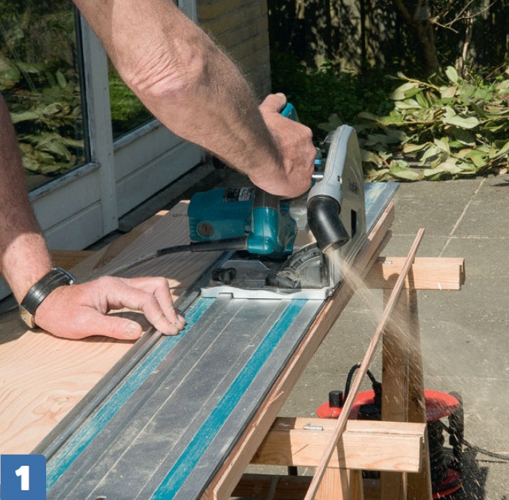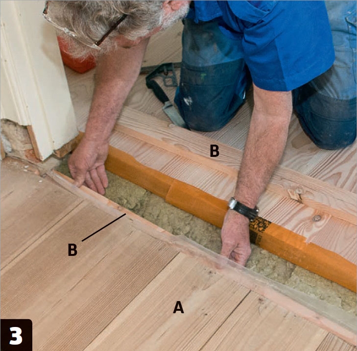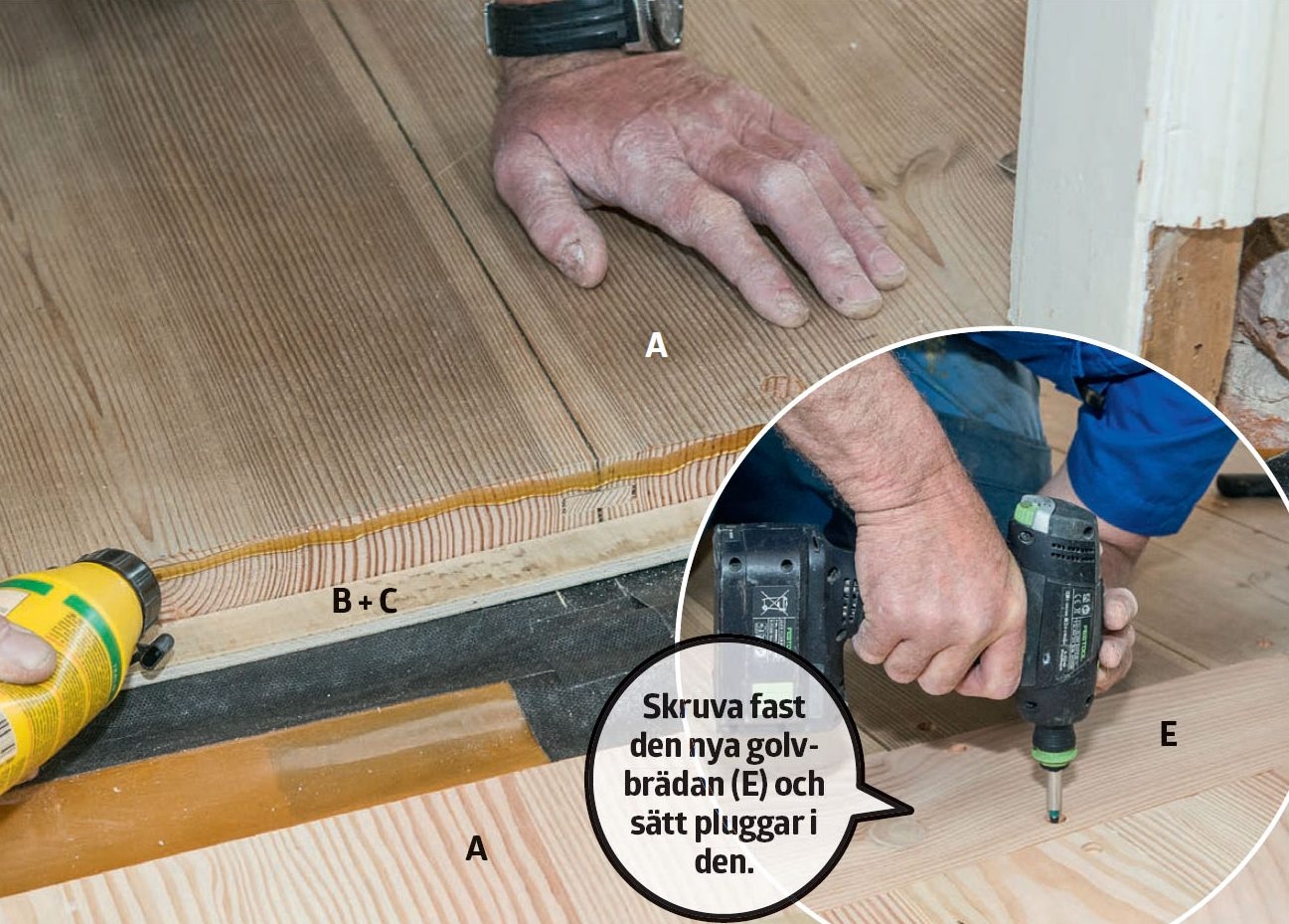 Mät och såga till den nya brädan (E) med en sänksåg med styrskena. Börja med att såga brädan en aning för bred i förhållande till hålet mellan de två golven. Det är enklare att såga bort lite än att lägga till något.