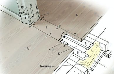 Påför polyuretanlim på stödlisterna (B) och på sidan av golvet (A) och lägg i brädan (E). Banka den på plats med en hammare. Kom ihåg att lägga en träkloss emellan så att det inte blir märken på brädan. Vi limmar på en extra list (C) i den sida där golvet är tunnare.