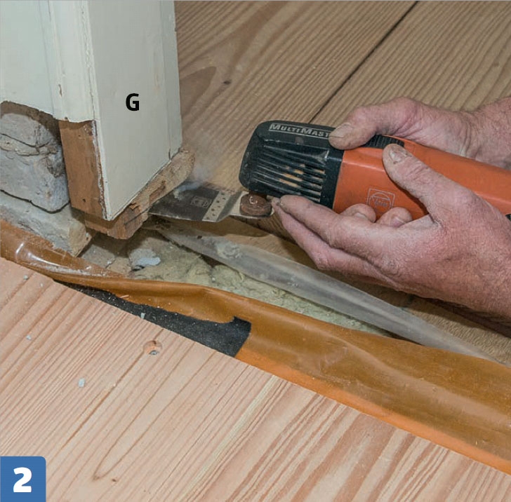 För att få in den nya brädan (E) under dörrkarmen (G) måste man såga av lite på båda sidorna. Använd multiverktyget och såga inte av mer än nödvändigt.