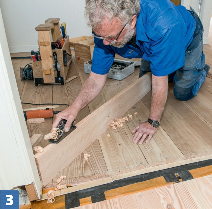 Hyvla nu till den ena sidan av den nya brädan så att den passar precis, men gör kanten lite sned, så att brädan är lättare att få ned i hålet. Den får gärna sticka upp 1 mm, eftersom golvet därefter ska slipas.