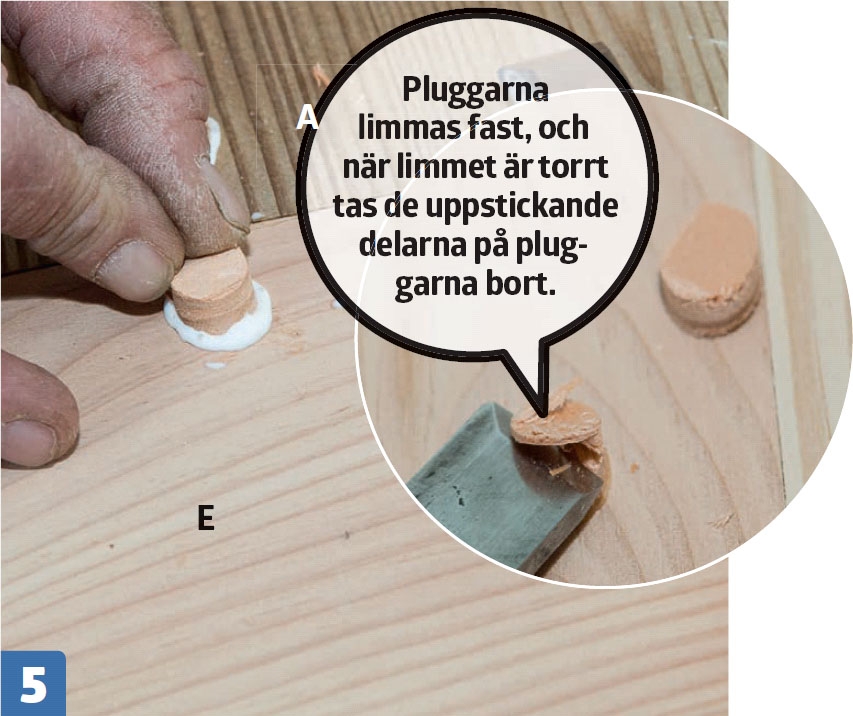 Karmstyckena (H) monteras med lim och skruvar som försänks. Skruvhålen och skarven spacklas och slipas sedan med slippapper.