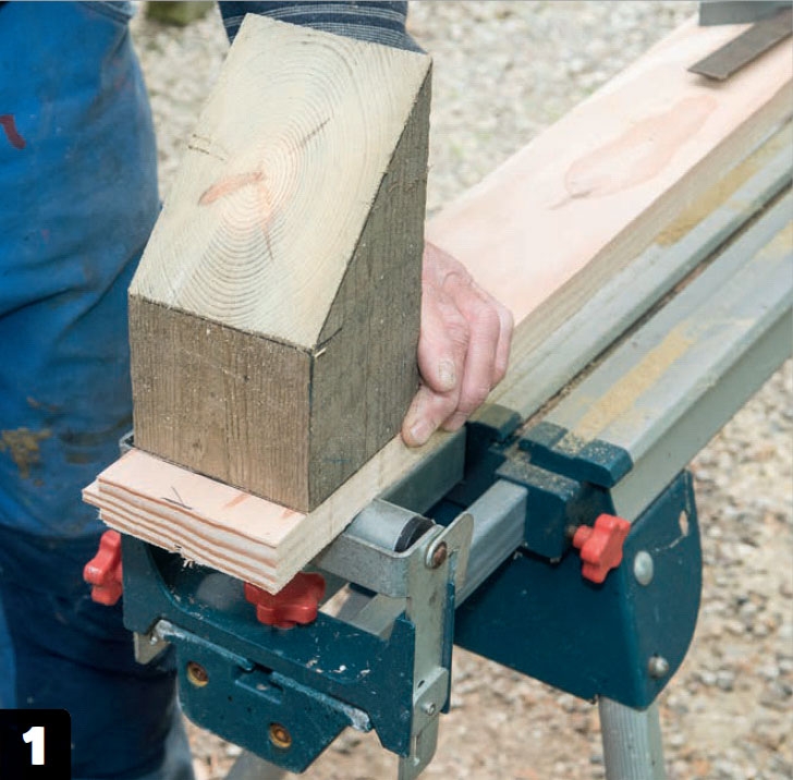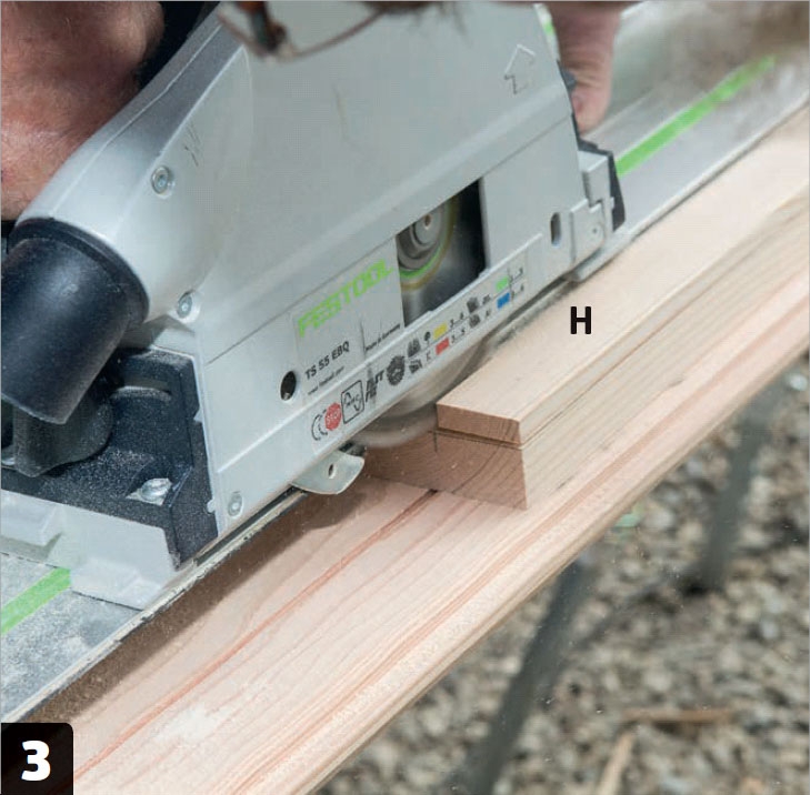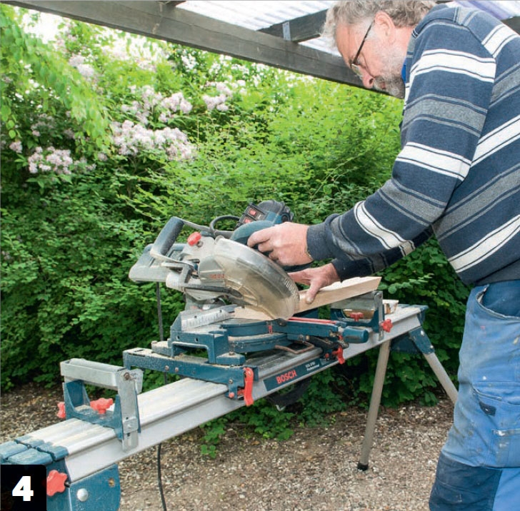 Såga bort en bit av en stolpe i en vinkel på 45°. På så sätt har du en sågjigg att såga bort karmen (G) helt exakt efter.