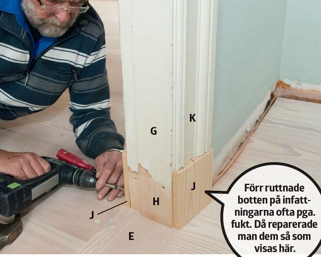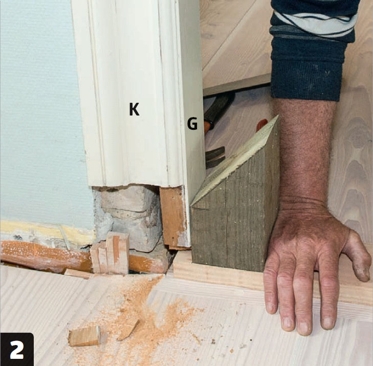 För att kunna montera den nya golvbrädan är det nödvändigt att ta bort lite av de lodräta dörrkarmarna. För att få en fin avslutning ska lite mer av karmarna tas bort och nytt trä ska sättas in. Det nya träet har samma profil som de befintliga. Men med en hemmagjord sågjigg och lite omsorg är det inte alls så svårt.