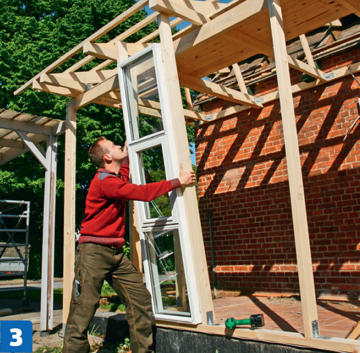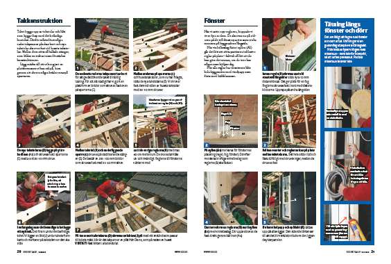 Då kan fönster och reglar sättas på plats mellan takstolarna. Det hela sätts i lod och fästs tillfälligt med skruvtvingar, medan de skruvas fast.