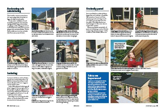 Innan panelbrädorna spikas på förses byggnaden med vindpapp och spikläkt. Här använder vi Superwood. De är djupimpregnerade med trägrund, så att vi slipper grunda träet innan det ska målas. Träet håller lika bra som tryckimpregnerat virke, men utan att tungmetaller använts.