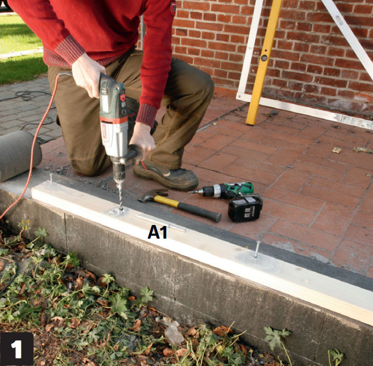 Längs plattans ytterkant sätts en syll (A1) på syllpapp. Förborra med ett 10,5 mm borr och fäst syllen med 10 x 115 mm spikplugg. Det lite större hålet gör det enklare att bli av med borrdammet.