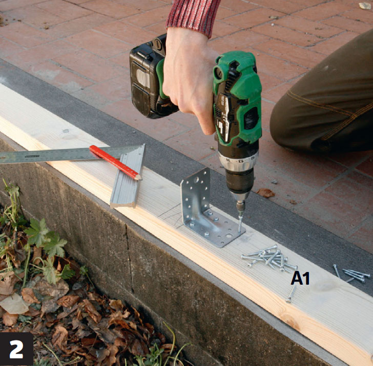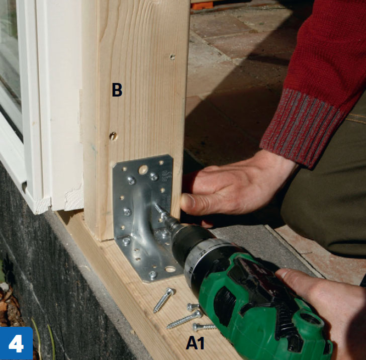 På syllen (A1) skruvas en rad vinkelbeslag. Beslagen ska stötta reglarna (B) längs tillbyggnadens lång- och kortsida (se ritning).