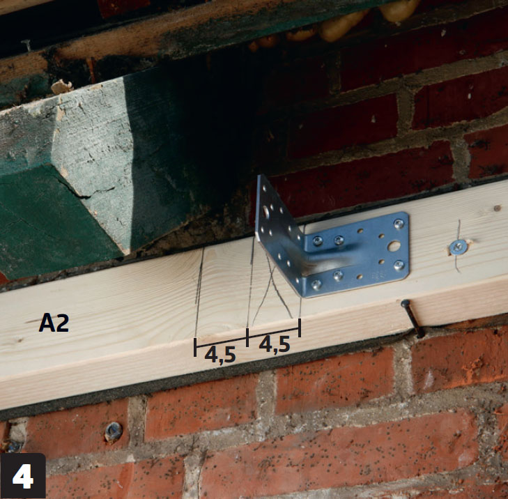 Reglar (B) i varje ände och i mitten sätts i lod. Genom att lägga en stödbjälke ut från bärlinan (A2) fixeras första hörnstolpen tillfälligt, så att den kan justeras i lod i förhållande till väggen.