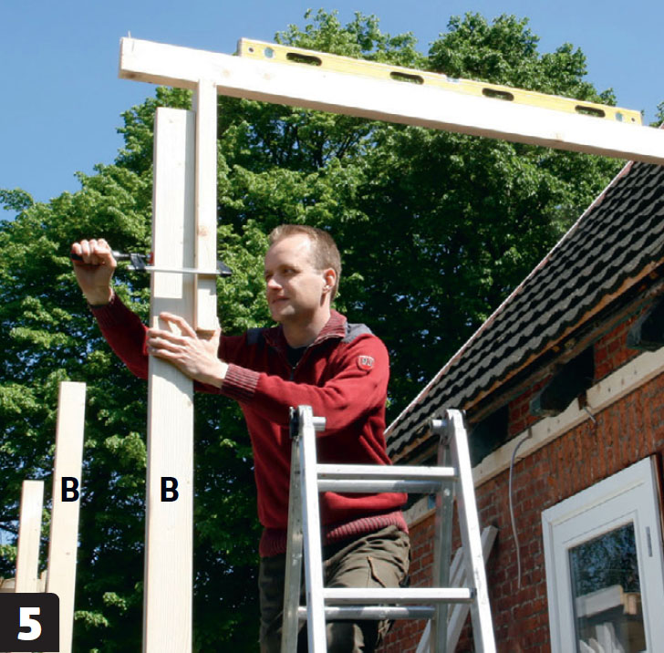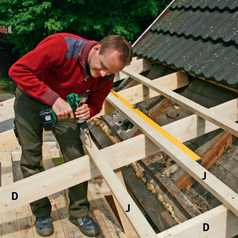 Mellan ändarna på sparrarna (C) och husets takstolar, som nu har frilagts, sätts de nya takstolarna (D). Vi skruvar fast dem vid sidan av husets takstolar med 5 x 90 mm skruvar.