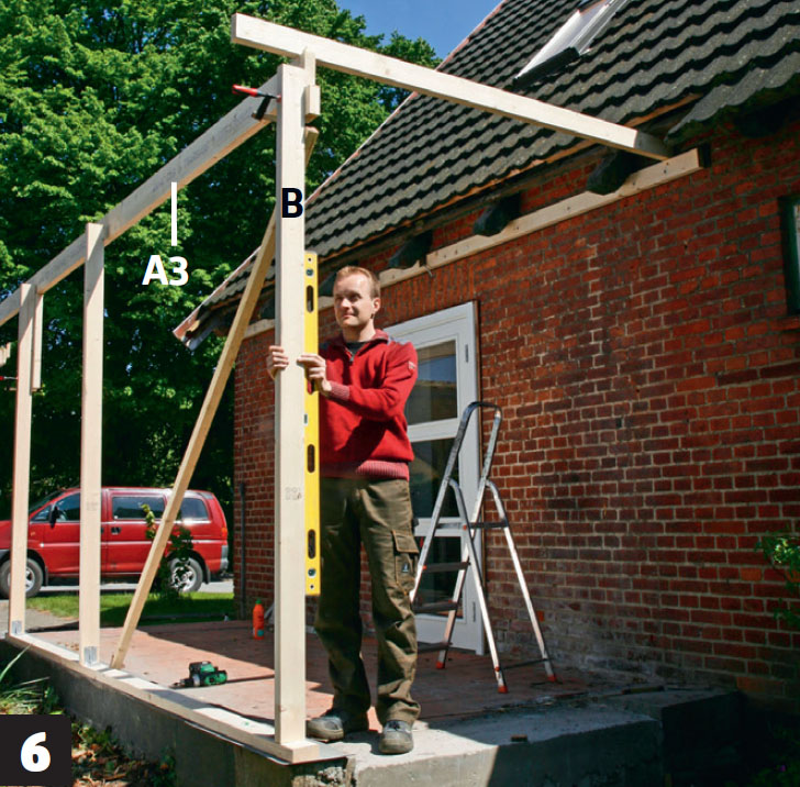 På reglarna (B) fästs en bärlina (A3). Nu kan hörnstolpen justeras i lod åt det andra hållet. En snedsträva håller den på plats. Därefter kan de övriga reglarna lodas in.