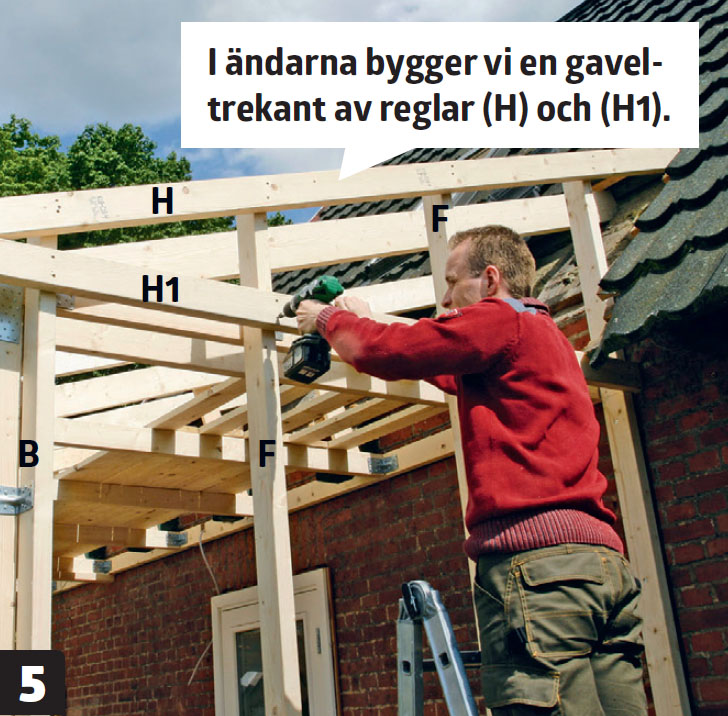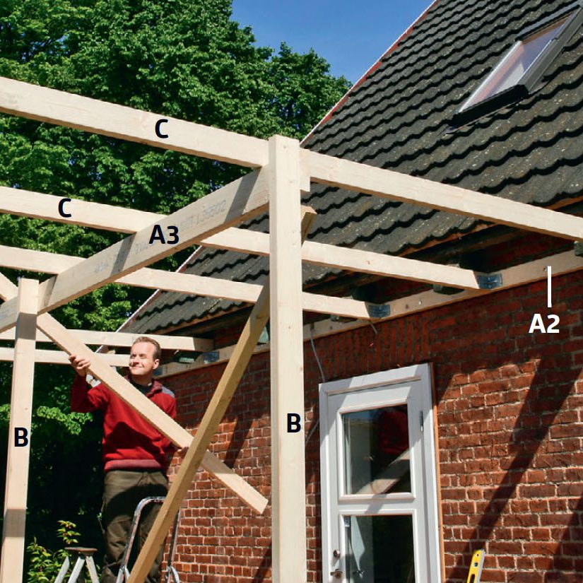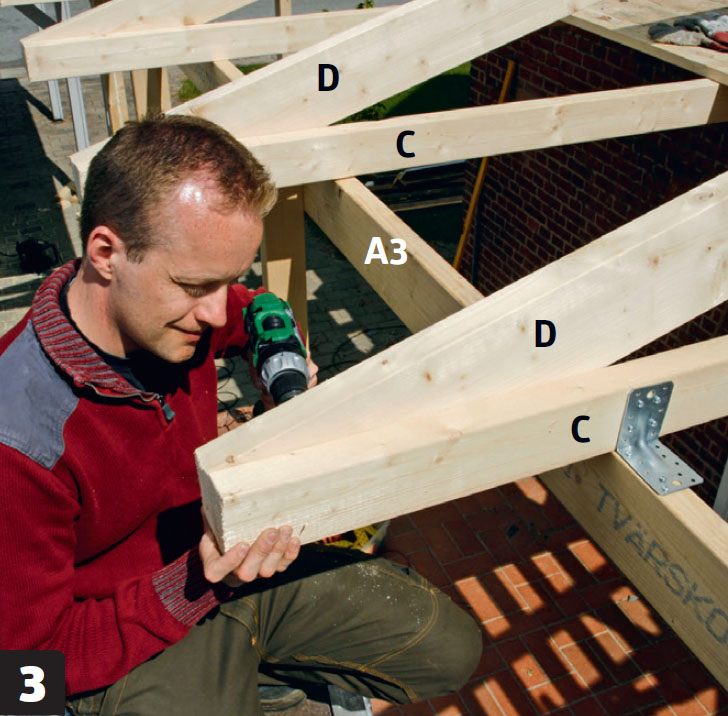 På de två bärlinorna (A2 och A3) fästs sparrarna (C) i förlängningen av husets takstolar. På bärlinan på väggen (A2) sätts de i vinkelbeslag. De läggs ovanpå den yttre bärlinan (A3) och skruvas fast med vinkelbeslag. Sparrarna (C) sågas till i exakt längd innan de läggs upp. Det är lättare än att kapa efteråt.