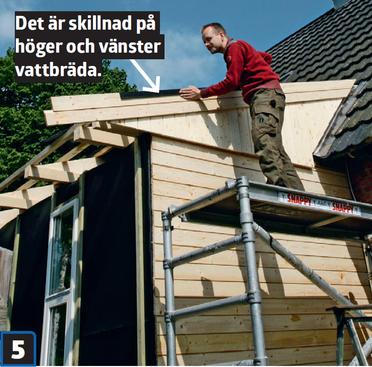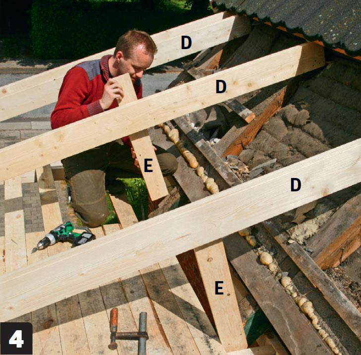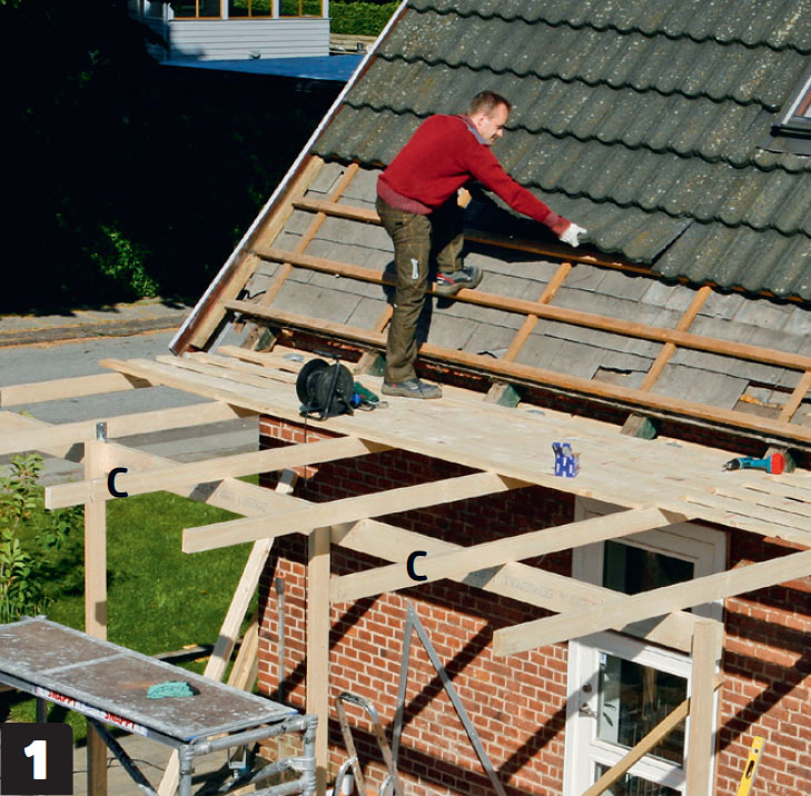De nedersta raderna takpannor tas bort för att ge det blivande taket tillräcklig lutning. För att stå stadigt har vi gjort en plattform av brädor som skruvas fast ovanpå sparrarna (C).