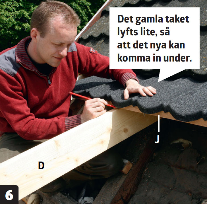 I förlängningen av det befintliga taket läggs ett nytt tak. Det förs in under det befintliga taket. Vi lägger en läkt (J) under takets framkant och markerar på takstolen var den ska sitta.