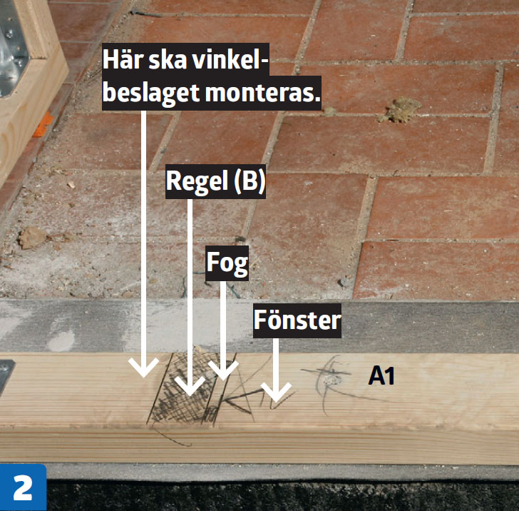 På syllen (A1) markeras för fönsternas placering (regel, fog, fönster). Därefter monteras kraftiga vinkelbeslag som reglarna (B) ska fästas i.