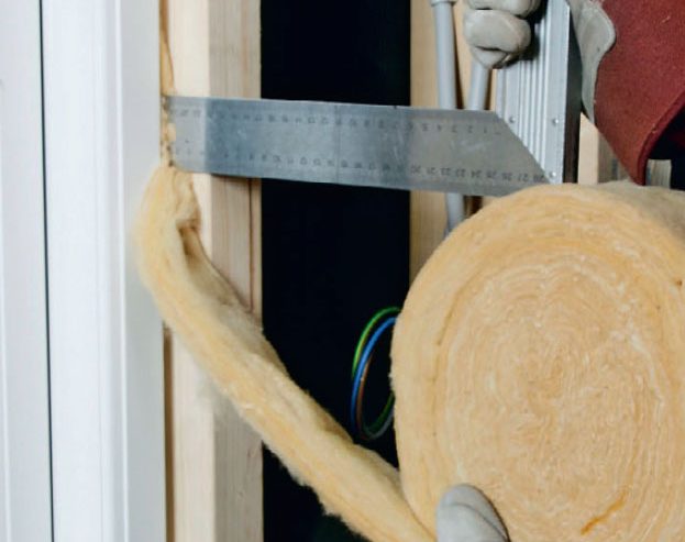 Från insidan fyller vi fogen med mineralull - men inte för kompakt, så att luften pressas ut. Packad mineralull isolerar inte.