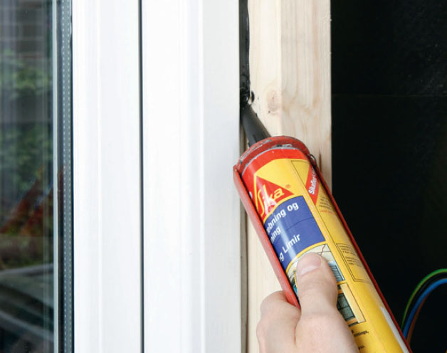 Det är viktigt att fogen runt fönster och dörr är tät. Utifrån gör vi en gummifog utanpå en bottningslist.
