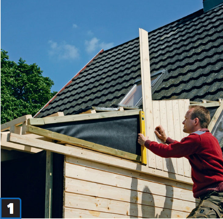 Gaveltrekanten kläs med stående panel. Vi börjar vid kanten på husets tak och arbetar oss utåt, medan vi ser till att alla brädor står lodrätt.