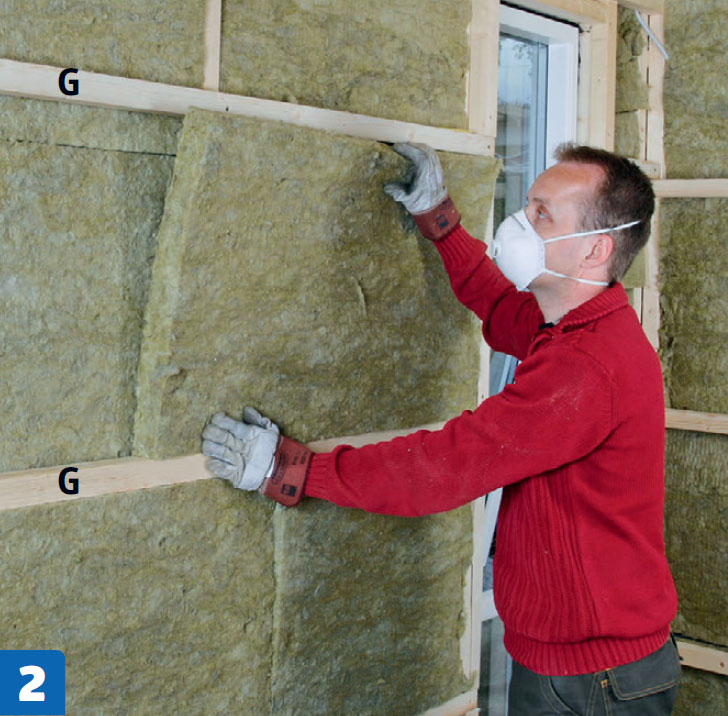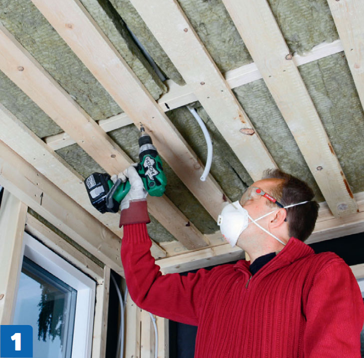 I taket håller glespanel isoleringen på plats. I väggarna skruvas reglar på 45 x 45 mm fast i de stående reglarna med ett inbördes avstånd som motsvarar en isoleringsskivas bredd minus 1 cm, så att skivorna sitter i spänn.