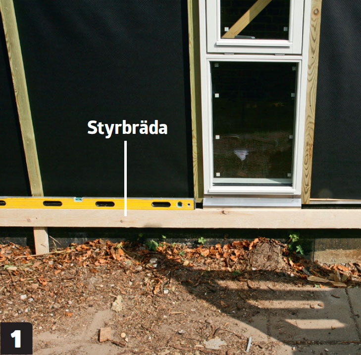 Längs byggnadens undersida (grundens ovansida) fästs en vågrät bräda tillfälligt. Brädan ska sitta i våg, eftersom den används för att panelbrädorna ska bli vågräta.