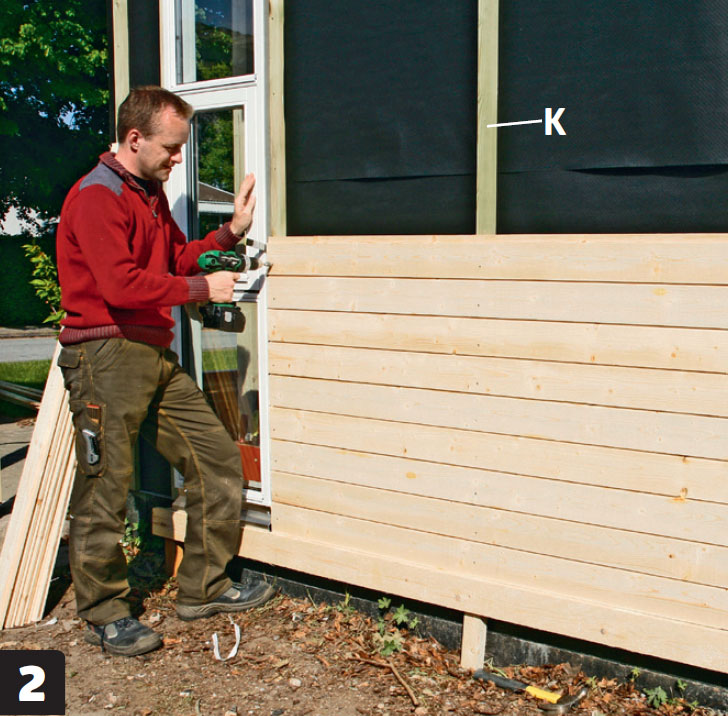 Ovanpå brädan läggs de spontade panelbrädorna och skruvas fast på spikläkten (K) i brädans nedersta tredjedel, då är det lätt att få nästa bräda på plats.
