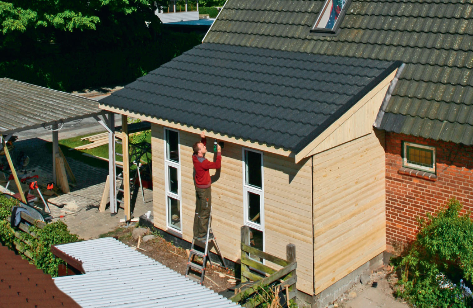 De skruvas in i takläkten (J) med specialskruvar som är i det närmaste osynliga på håll. Längs sidorna tätas övergången mellan tillbyggnad och tak med zinkplåt som spikas på innan övergången täcks med panelbrädor. Till slut täcks vindskivorna med en vattbräda från Decra som passar till taket.