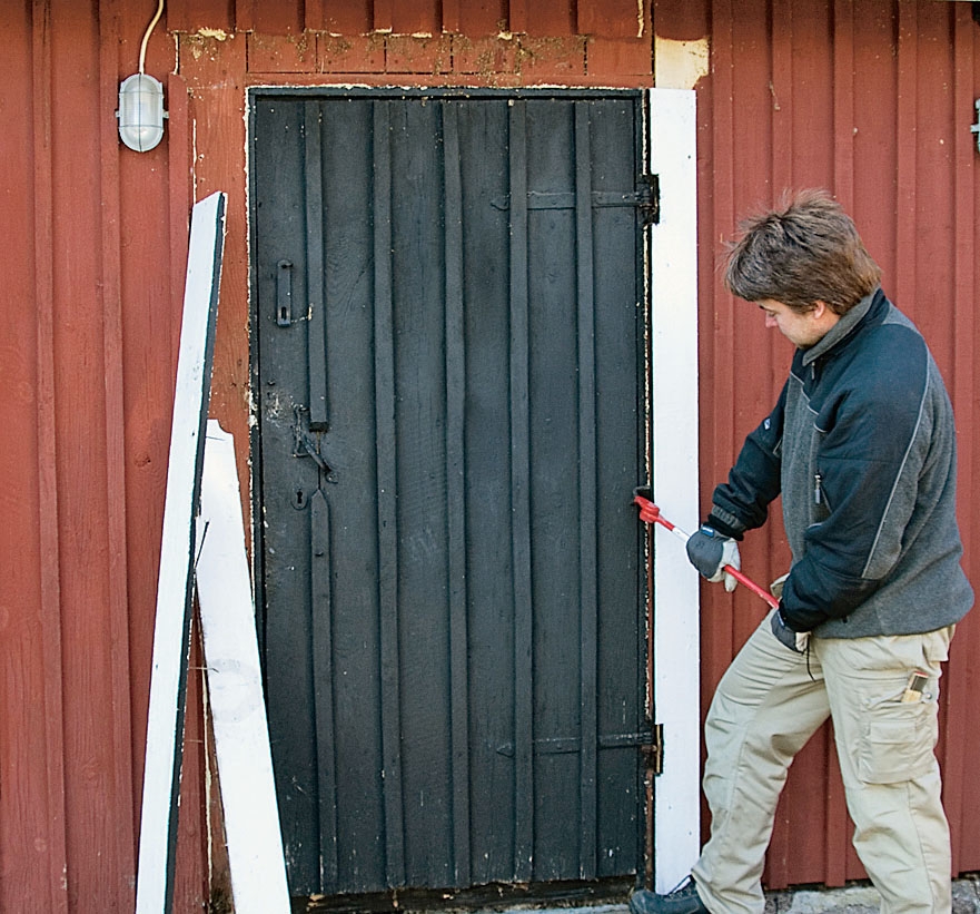 Börja med att bryta loss de gamla foderlisterna. Har de suttit länge, och den nya dörren har andra mått än den gamla, är det inget som går att spara. Ett gott råd är att ta det lite försiktigt.