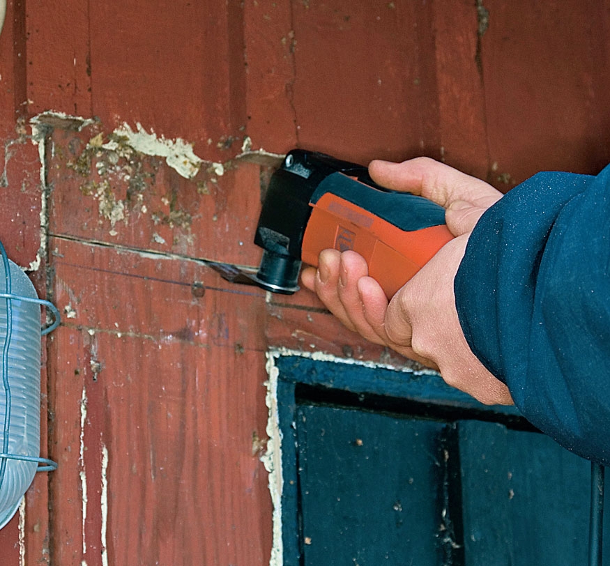 Vi bevarar den övre delen av brädan för att spara tid. Vi har en Feincutter - ett specialverktyg för svåra arbeten, där man t.ex. behöver komma åt där det är trångt. Har du inte detta verktyg så är det nog lättare att byta hela brädan.