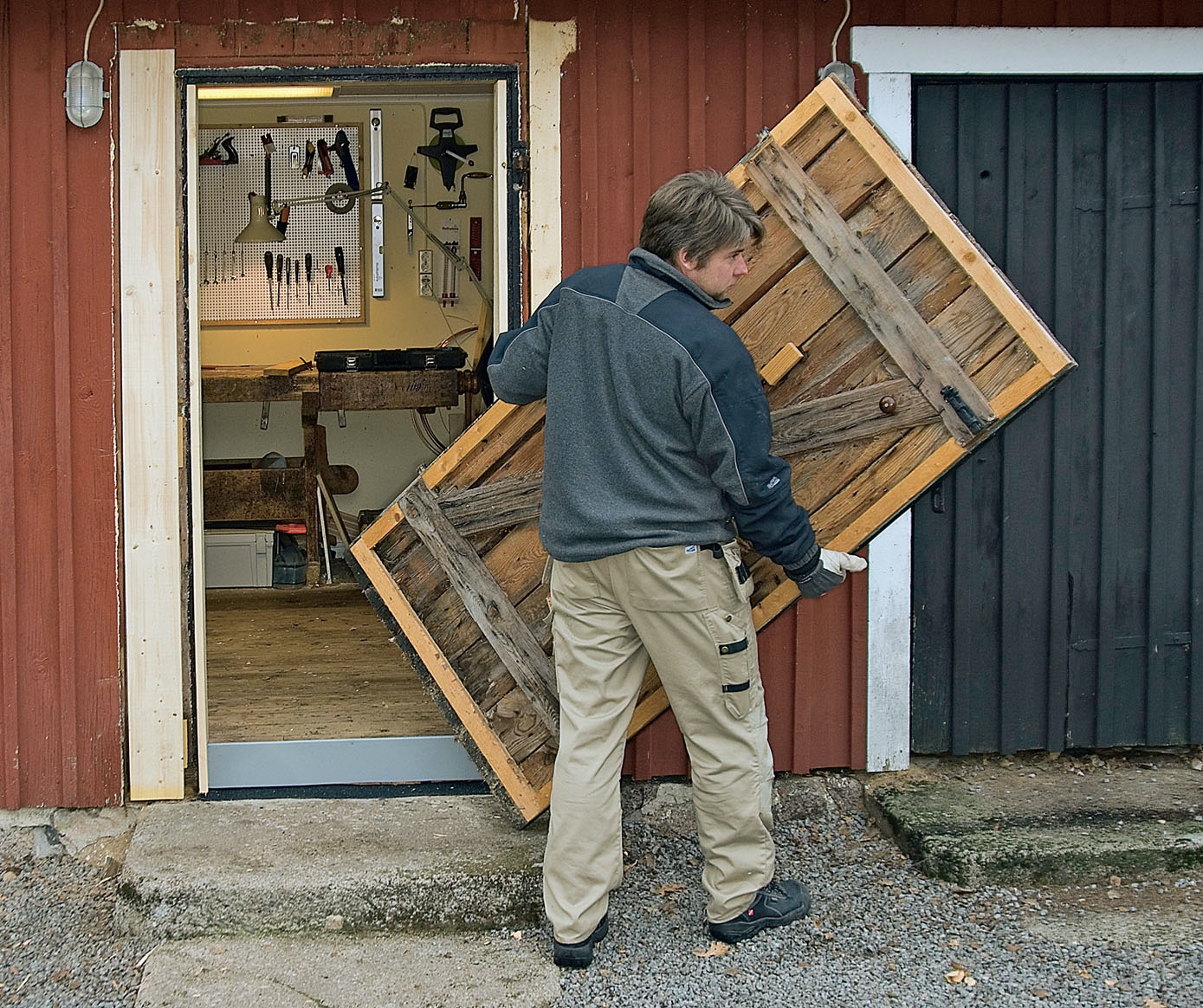 Dörren hängs upp på gångjärnen och då har man glädje och nytta av en medhjälpare, även om en person själv kan hantera dörren.