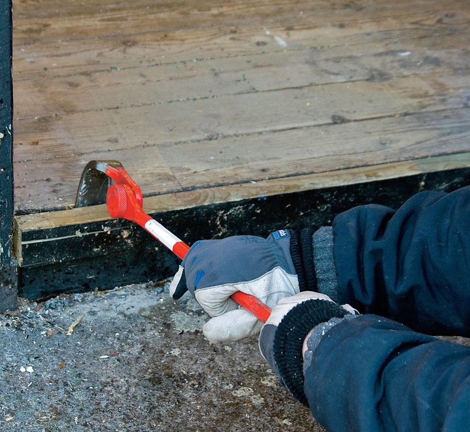 Brädan som satt under den gamla dörren tas bort. Det finns inga normala fall där allt bara flyter på. Det blir alltid unika lösningar för varje enskilt projekt. Här skulle dörren gå ner till marken så vi satsar på att bygga ett trappsteg.