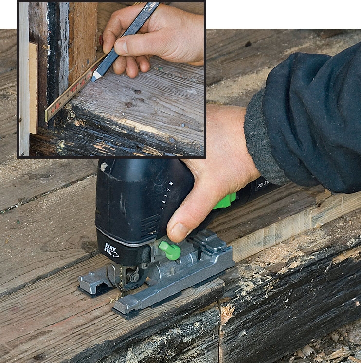 Med ett extra långt sticksågs-bladnår vi igenom både golvbrädor och underliggande regel. Här gäller det att köra lugnt utan att pressa på för mycket för då går bladet av.