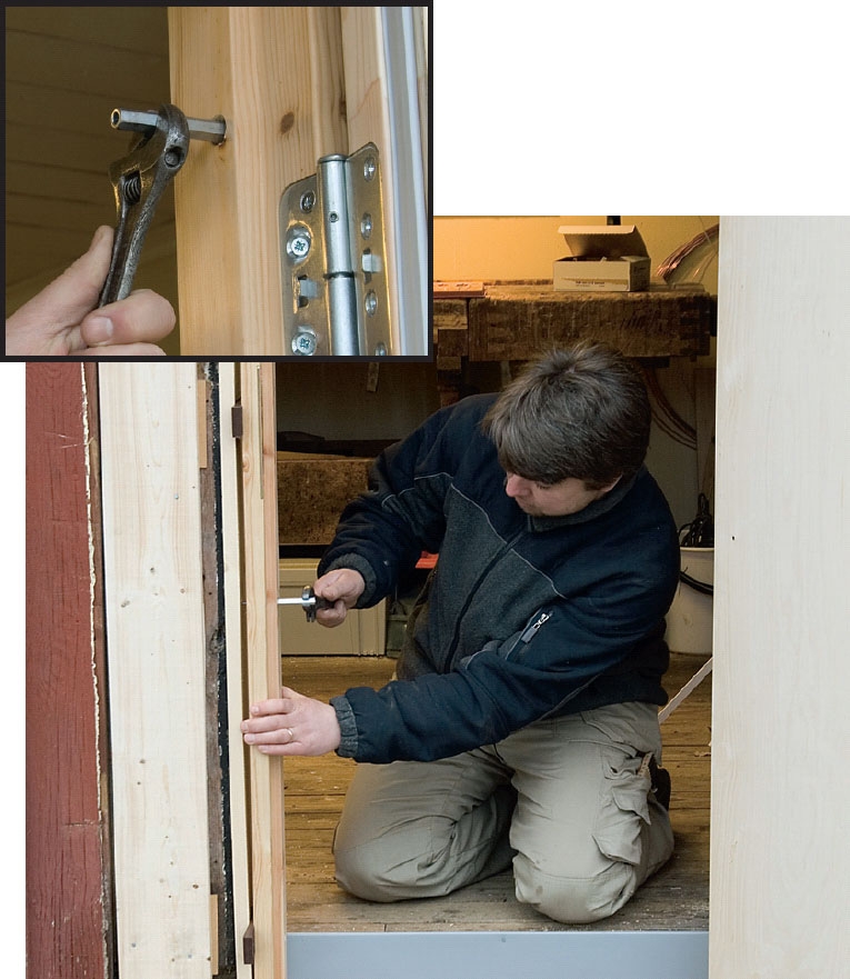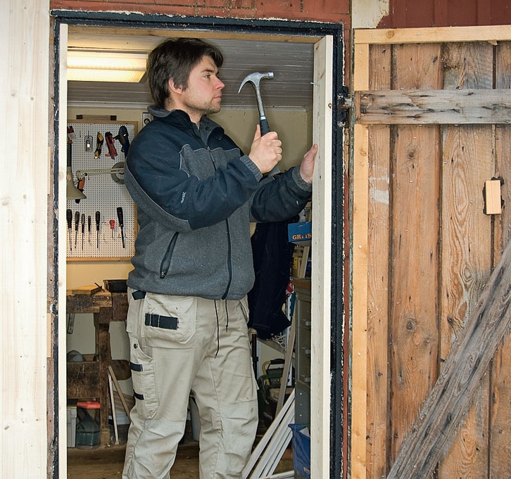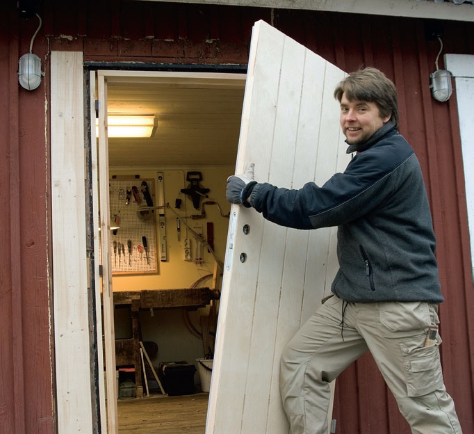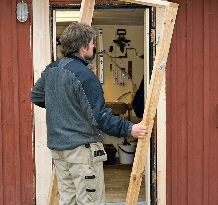Det är dags att sätta dörren på plats, täta runt karmen och till sist montera foderlister. Men innan allt detta görs - och innan de sista skruvarna i karmen dras fast - sätter vi dörren på plats. Då minskas risken för större justeringar, om karmen inte sitter som den ska.