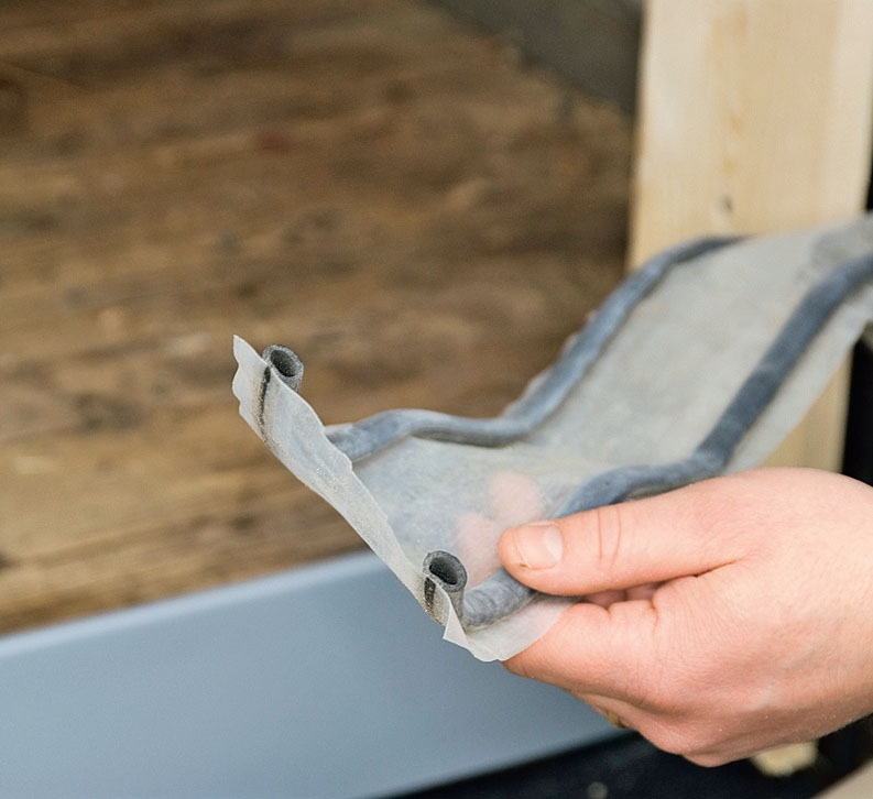 En plastremsa med tätningslister läggs direkt på tjärpappen för att förhindra onödigt kalldrag från grunden. Plastremsan finns att köpa på rulle i olika bredder i bygghandeln.