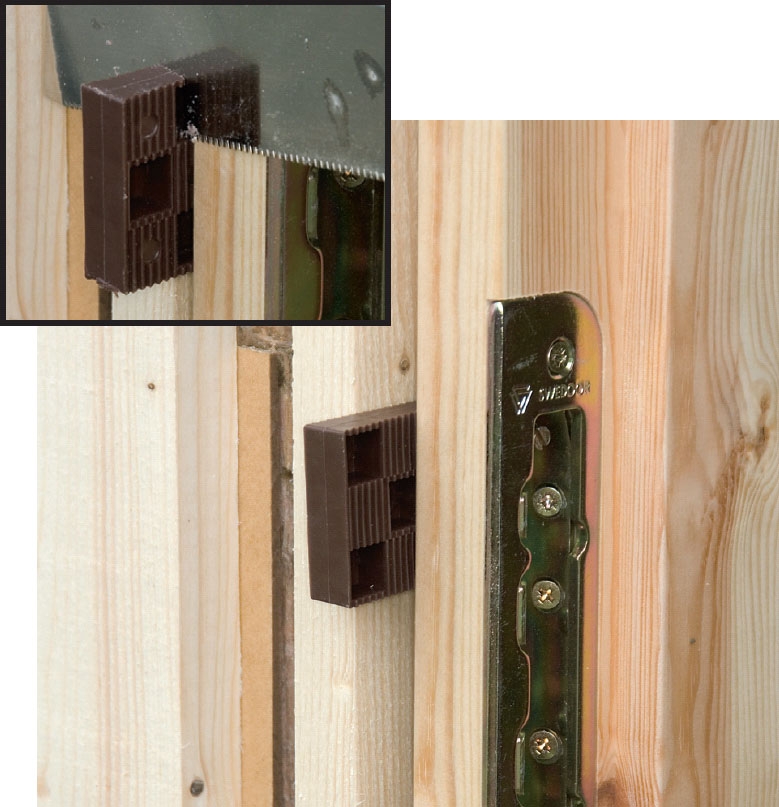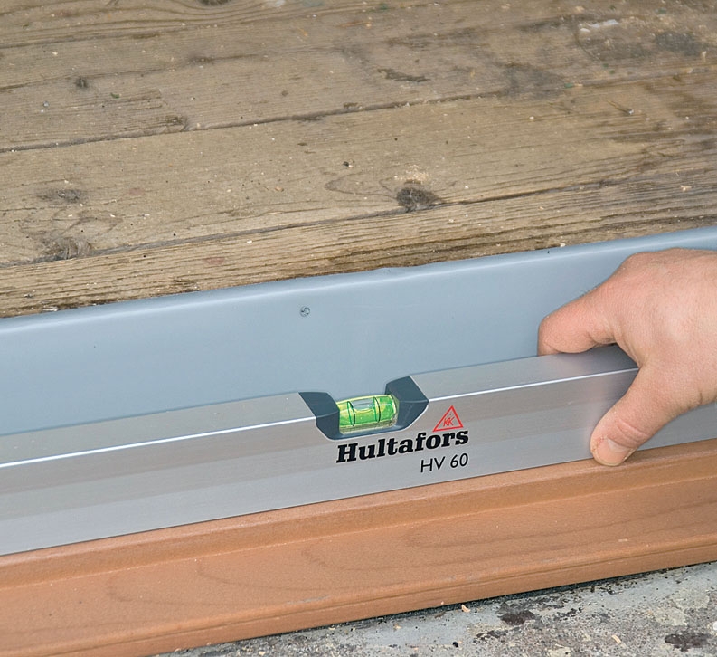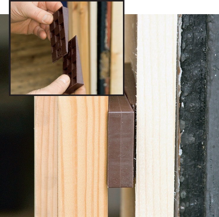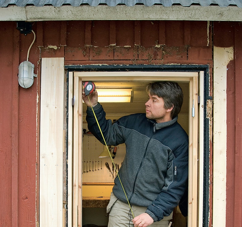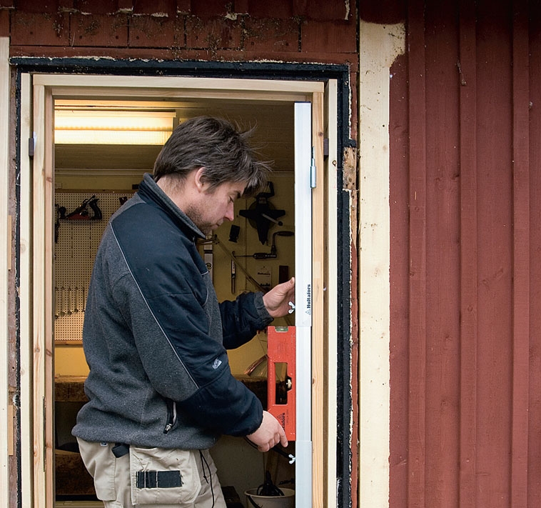 Sidorna justeras med kilar tills karmen också står lodrätt. Du kan klara dig med träkilar, som din farfar gjorde, men resultatet blir bättre och arbetet går lättare om du väljer plastkilar.