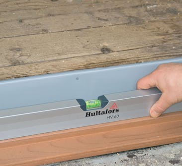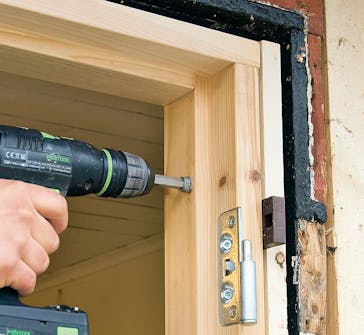 När du kilar upp karmen och fäster den, börjar du med att få tröskeln vågrät. Karmen fästs sedan alltid först på gångjärnssidan. Till monteringen väljer vi justerbara karmskruvar.