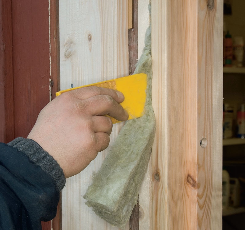 Springan mellan karm och vägg ska drevas. Använd en drevspade eller en tumstock för att trycka in isoleringsremsorna. Det finns färdiga remsor att köpa men det går lika bra med spill. Dreva från bägge håll.
