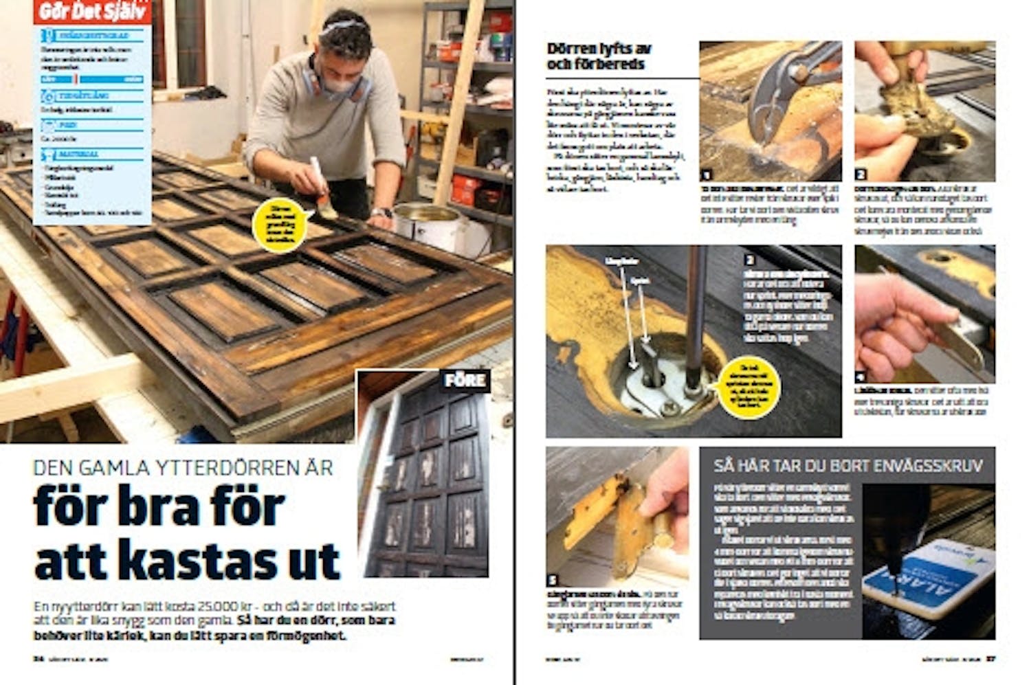Först ska ytterdörren lyftas av. Har den hängt där några år, kan några av skruvarna på gångjärnen kanske vara lite svåra att få ut. Vi monterar av vår dörr och flyttar in den i verkstan, där det finns gott om plats att arbeta.