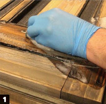 Nu, när färgen är borta, är det lättare att se hur dörren egentligen mår. Och det finns en del sprickor i träet. Sprick-or där vatten kan tränga in. De ska förslutas. Till det använder vi kemiskt trä, en tvåkomponentsmassa, som blandas och arbetas ner i sprickorna.