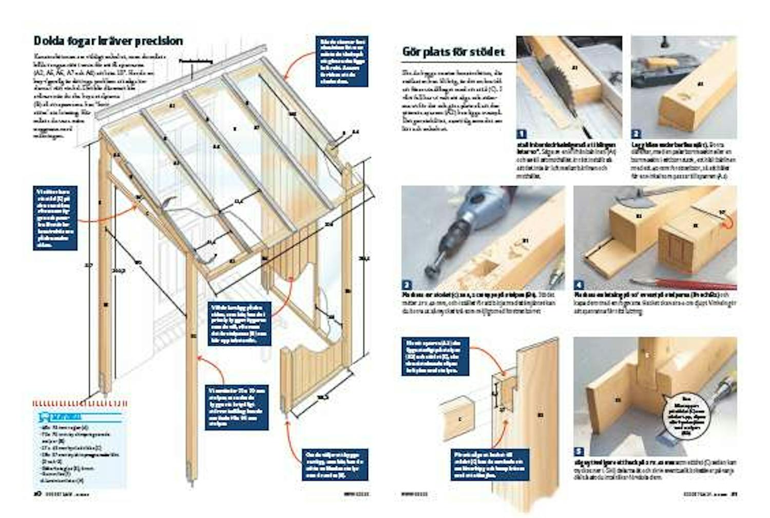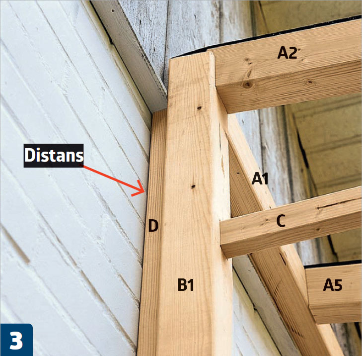 Ska du bygga en stor konstruktion, där snölasten kan bli hög, är det en bra idé att förse vindfånget med ett stöd (C). I vårt fall har vi valt att såga och stämma ut för det och göra plats så att den yttersta sparren (A2) kan ligga ovanpå. Det ger stabilitet, samtidig som det ser lätt och enkelt ut.