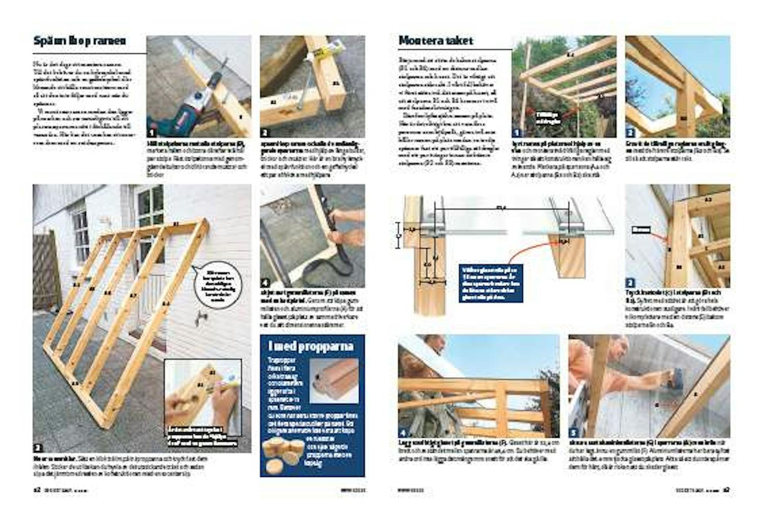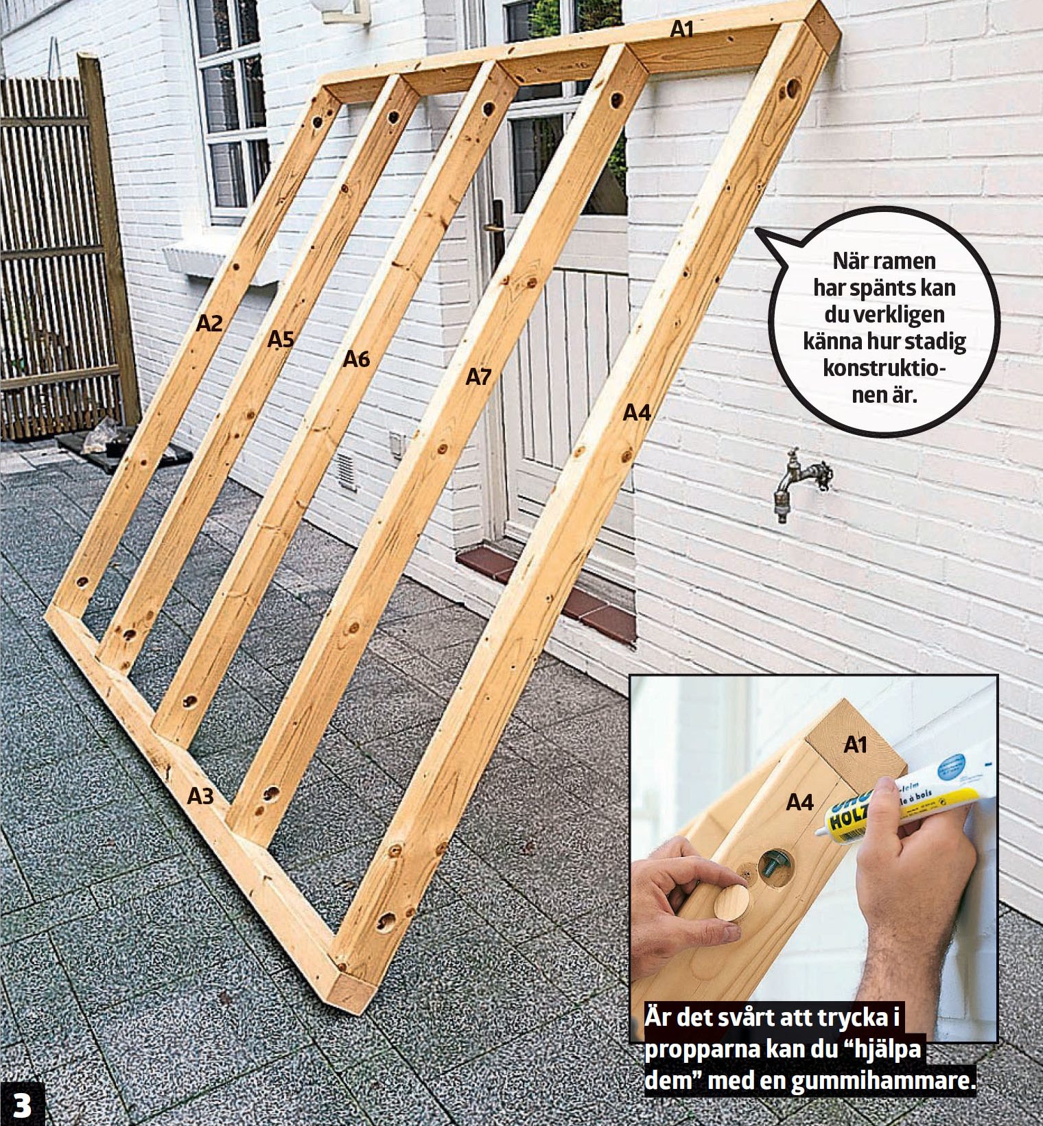 Vi monterar ramen medan den ligger på marken och ser naturligtvis till att placera sparrarna rätt i förhållande till varandra. Här kan det vara bra att numrera dem med en snickarpenna.