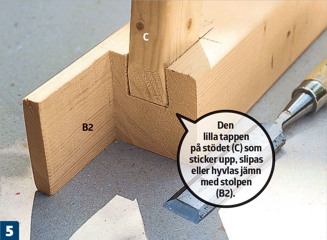 Markera för stödet (C) 200,2 cm uppe på stolpen (B1). Stödet mäter 27 x 43 mm, och i stället för att börja med stämjärnet kan du borra ut så mycket trä som möjligt med forstnerborret.
