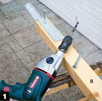 Håll stolpskorna mot alla stolparna (B), markera hålen och borra därefter två hål per stolpe. Fäst stolpskorna med genomgående bultar och tillhörande muttrar och brickor.