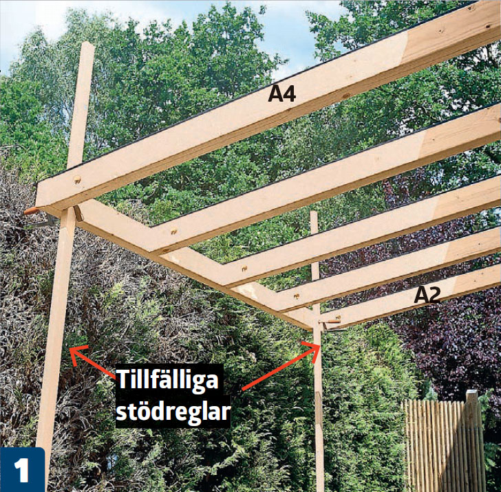 Lyft ramen på plats med hjälp av en vän och montera två tillfälliga reglar med tvingar så att konstruktionen kan hålla sig svävande. Markera på sparrarna (A4 och A2) var stolparna (B3 och B2) ska stå.
