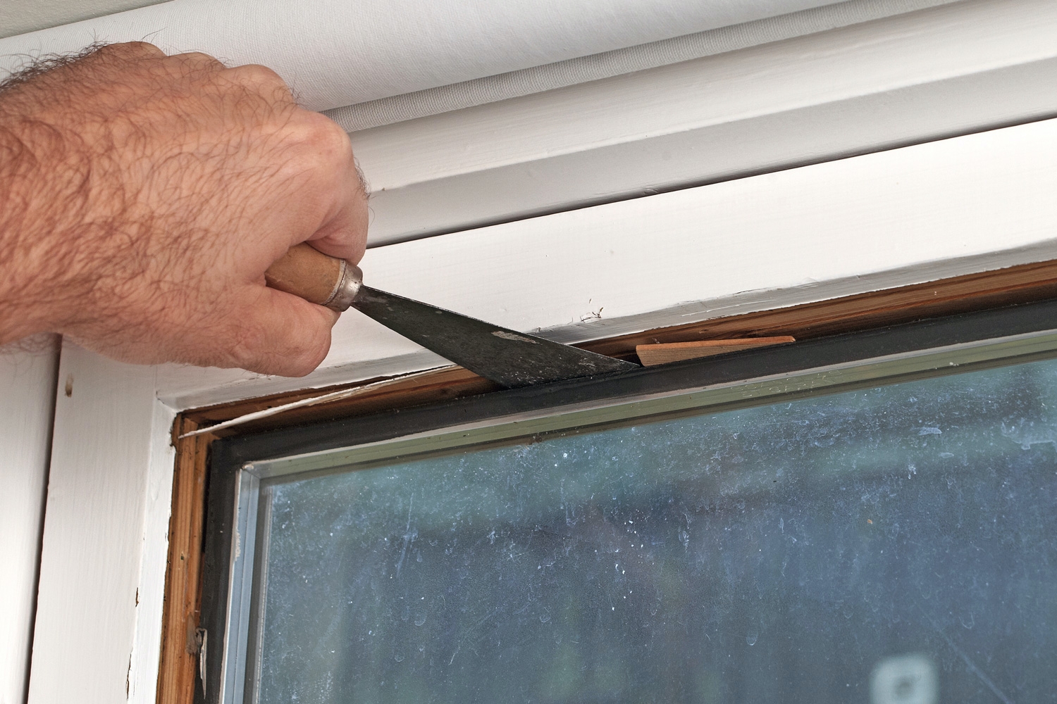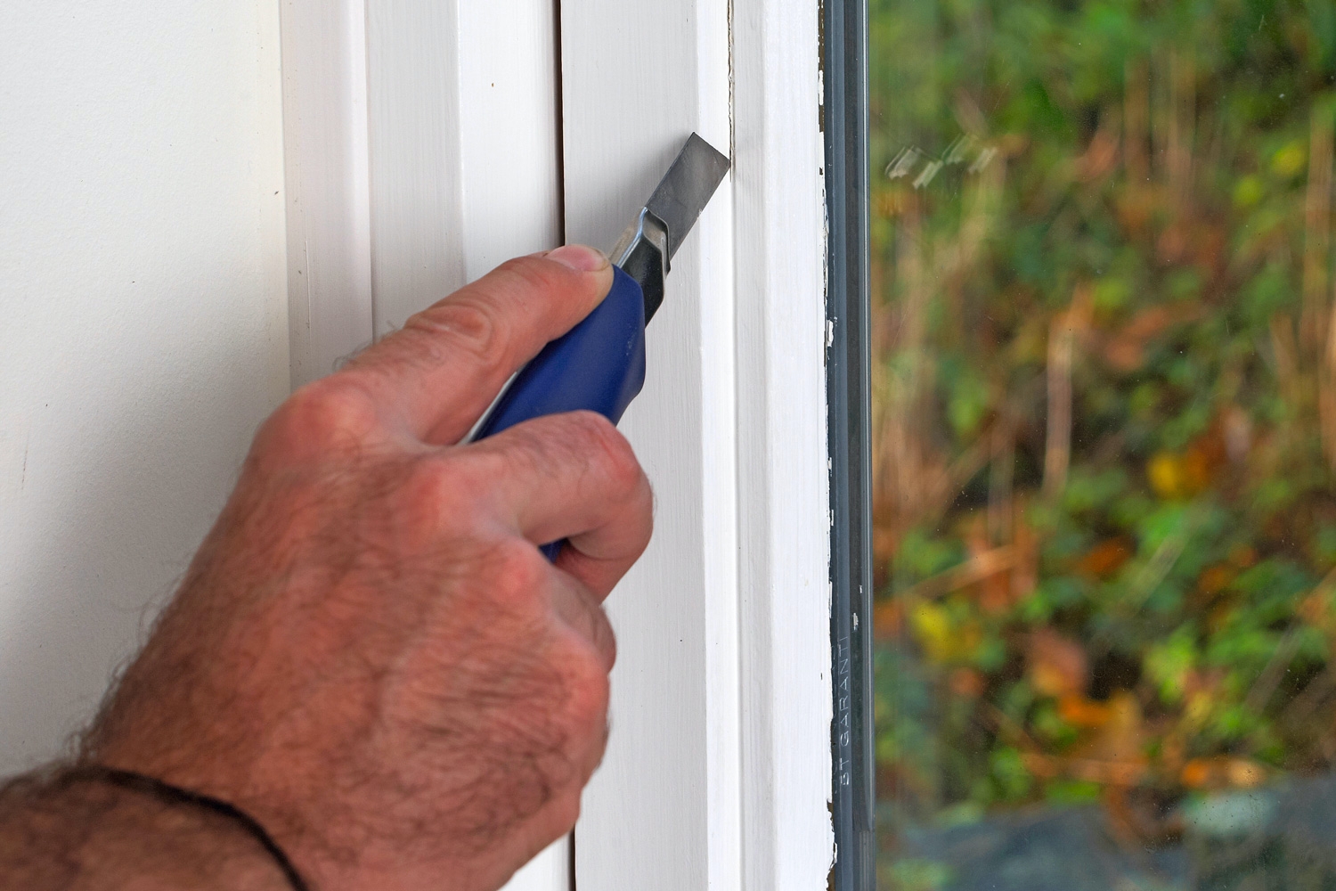 Skär först så att glaslisterna i sidorna lossnar och så att de släpper lätt när rutan ska bort. Med en vass hobbykniv är det lätt att skära igenom färgskiktet i skarven mellan fönsterbåge och glaslist.