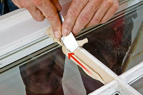 Allt löst kitt avlägsnas. För detta ändamål lämpar sig ett lite slitet stämjärn. Vänd den plana sidan in mot träet, så att du inte riskerar att hugga in i fönsterbågen.