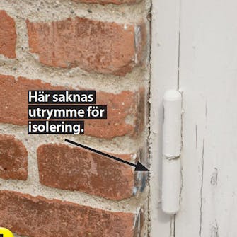 Detta ska du undvika: Här finns ingen plats för isolering och tätning runt fönstret. Man har antagligen uppgett fel mått vid beställningen och sedan har fönstret satts i utan isolering runt om.