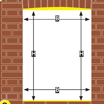 Här är de viktiga måtten: Höjden H mäts mellan reglar eller tegelstenar. Om ovandelen av öppningen är välvd mäts till en vågrät linje där valvet börjar. Mät bredden B från sida till sida.